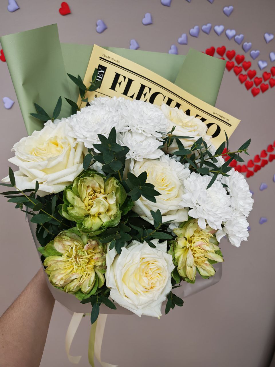 Белая гармония – символ чистоты чувств! Вдохновляющий букет из изысканной белой розы, нежной хризантемы и уникальной зелёной розы подчеркнёт оригинальность ваших эмоций и сделает любой момент особенным. Подарите близким красоту, которая говорит о вашем трепетном отношении!" Больше не нужно подбирать слова – пусть цветы скажут всё за вас!»