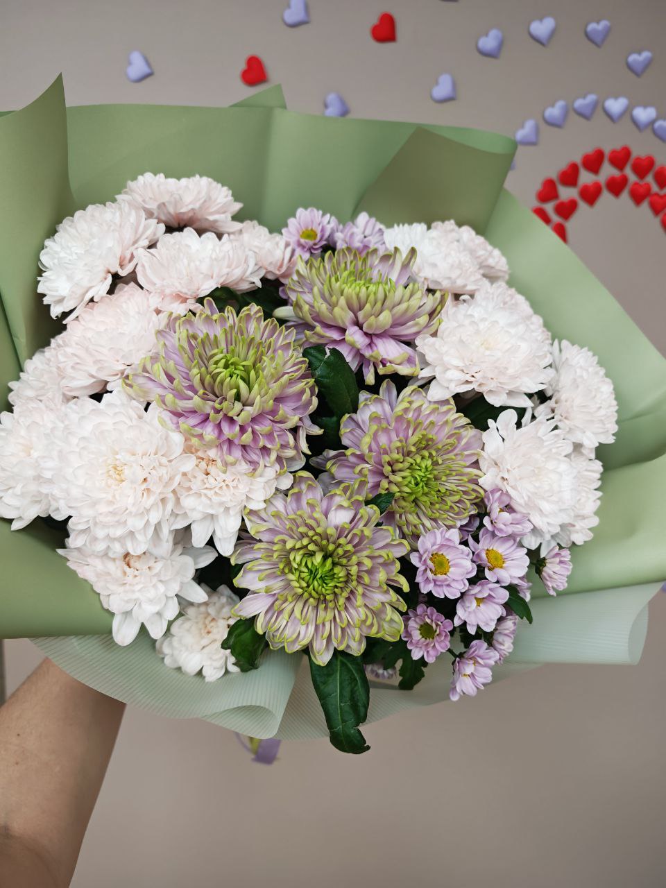 Этот букет подарит тепло и радость вашему любимому человеку! Яркие краски и нежные оттенки создают атмосферу уюта и гармонии. Хризантемы – символ долголетия и мудрости, станут идеальным подарком по любому поводу: от дня рождения до благодарности. Их изысканный аромат и изящная форма украсят любой интерьер и подарят минуты наслаждения каждому, кто их увидит.