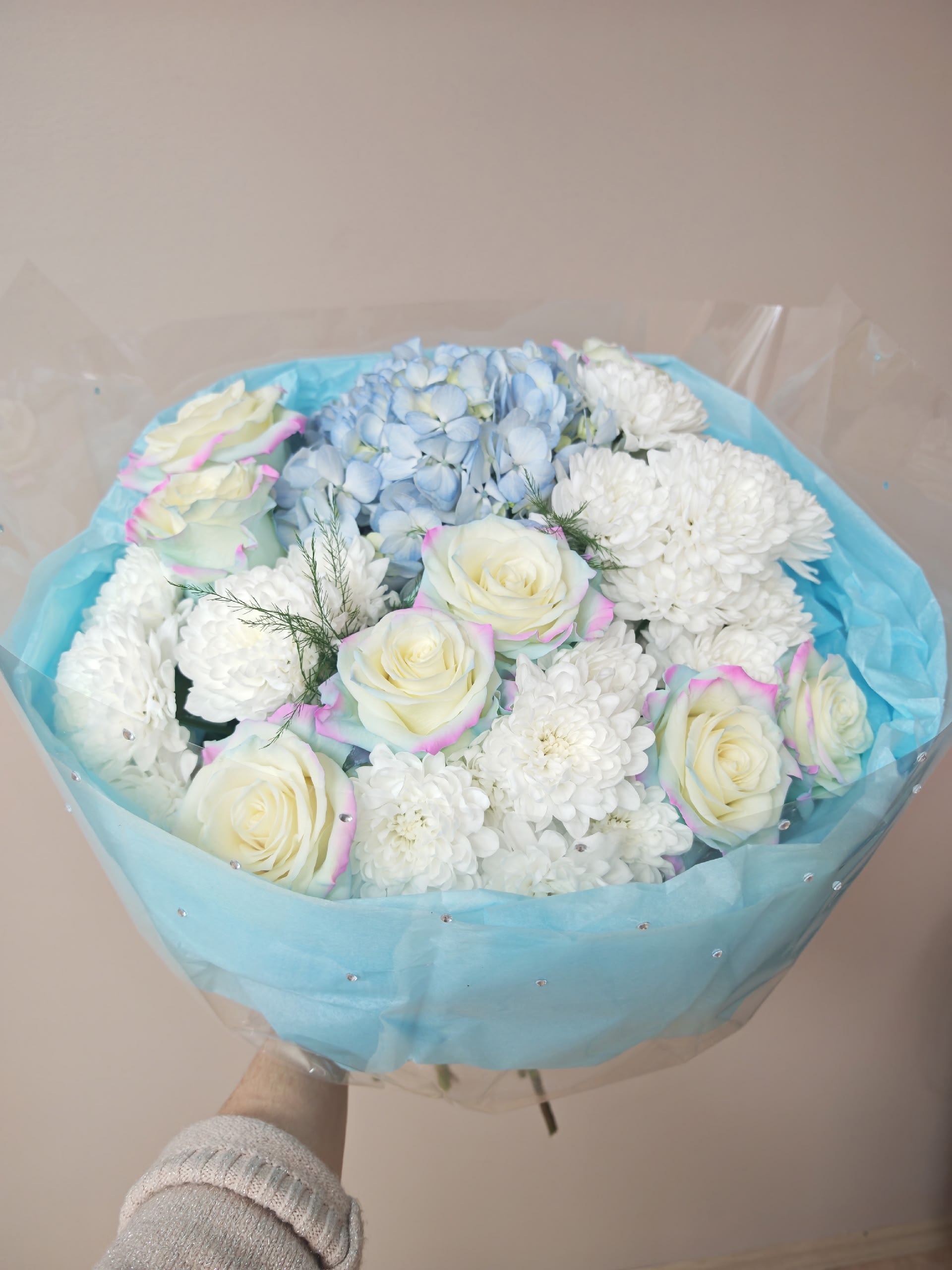 Букет из нежно голубой гортензии , белой хризантемы и розы. Гортензия -1шт Хризантема -3шт Роза -7 шт