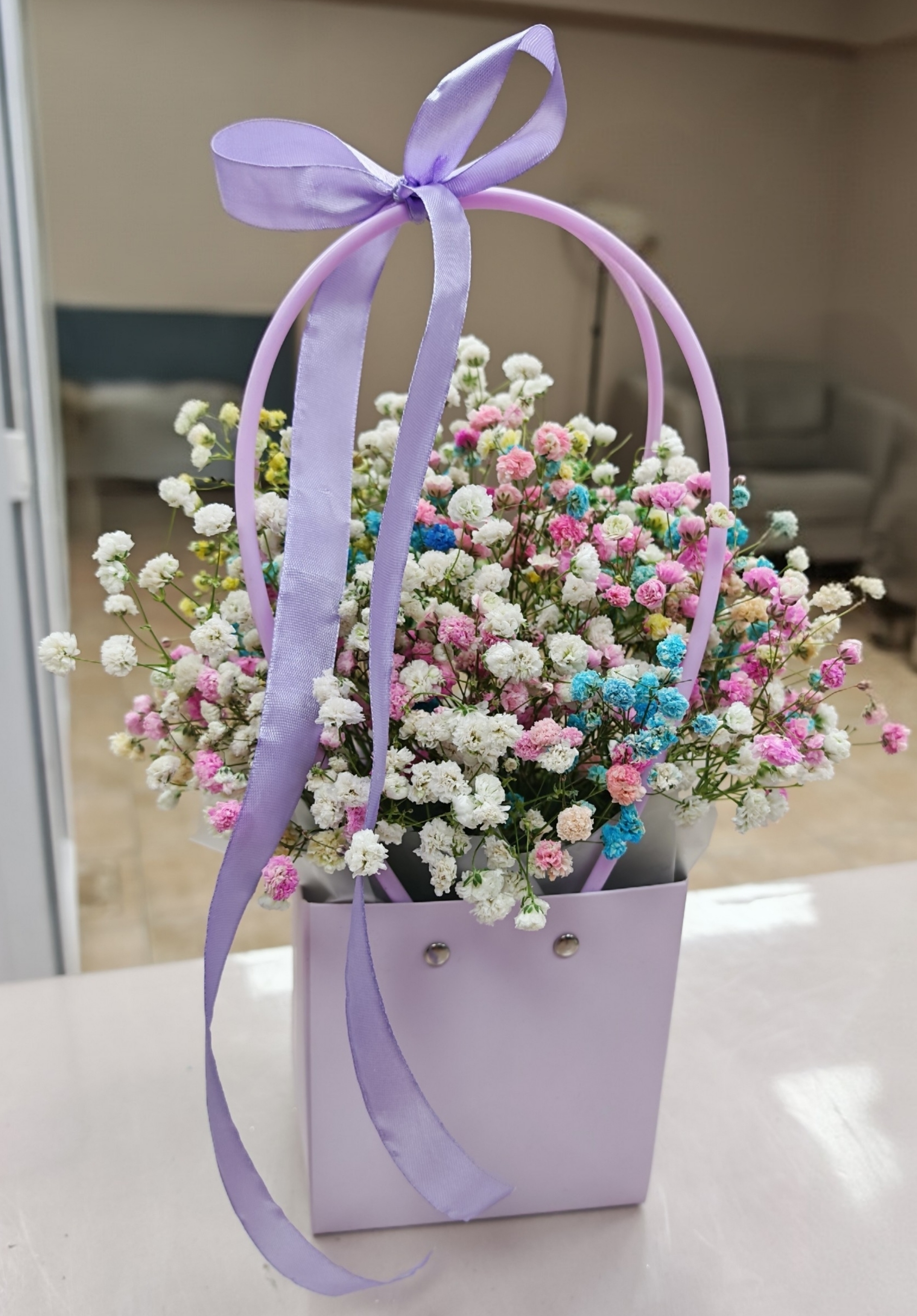 Воздушное облоко из цветной гипсофилы в стильной сумочке, поднимет настроение в любой ненастный день.